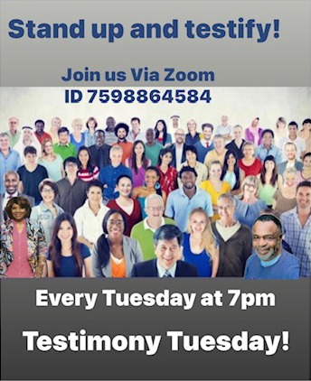 Come join us every Tuesday at 7pm, Via Zoom, where believers share what brought them to Christ, and there Peter convection that made them decide they would never deny or be ashamed again. Where testimonies from down and out, or up and out are shared, and how God saved their lives!